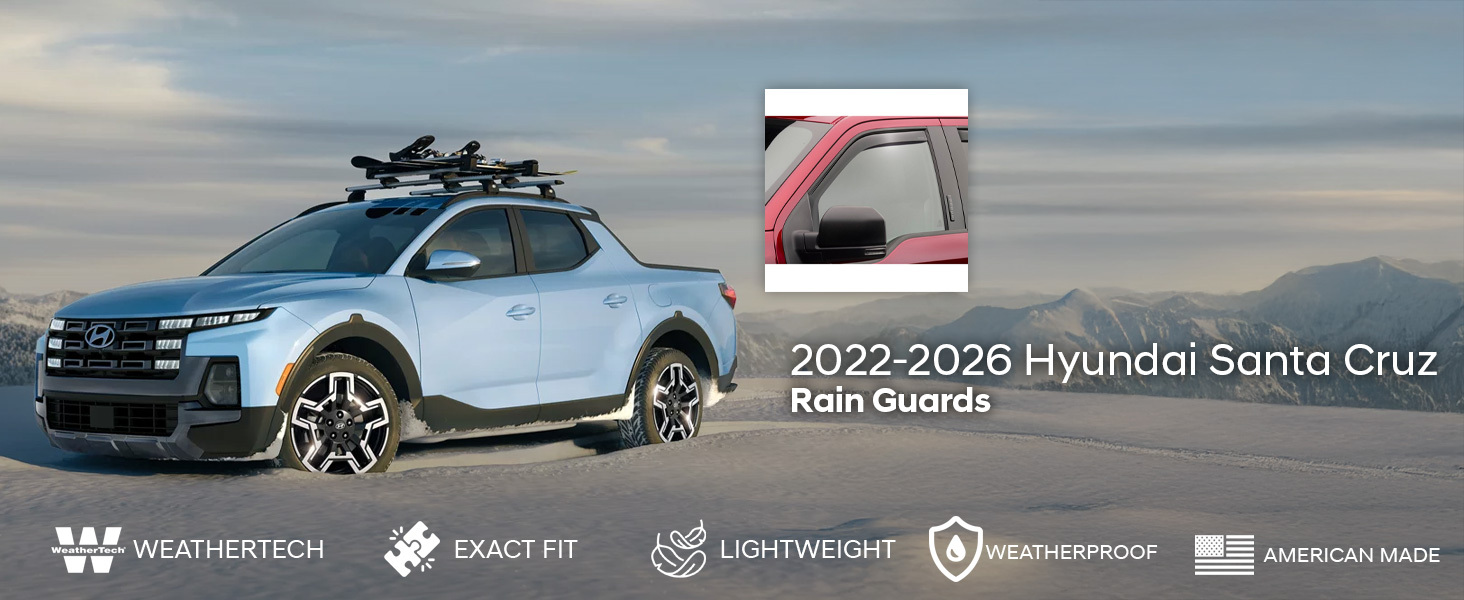 Protect your side windows from the rain, while also enjoying fresh air and reduced wind noise, with the 2022-2026 Hyundai Santa Cruz WeatherTech Rain Guards. Made by WeatherTech, these Side Window Deflectors are crafted from the finest 3mm acrylic material available. Crafted from high-quality, UV-resistant acrylic material, the WeatherTech Rain Guards are built to withstand the elements and provide long-lasting durability. Their custom-fit design ensures precise coverage for your vehicle's windows, allowing you to enjoy fresh air circulation while keeping rain, snow, and wind out. Precision-machined to perfectly fit your vehicle's window channel(s). Installation is quick and easy, with no exterior tape needed. Comes as a Set of 2! Experience enhanced comfort and convenience with the 2022-2026 Hyundai Santa Cruz WeatherTech Rain Guards – the perfect accessory to protect your pickup truck's interior from the elements while adding a touch of style to your ride. Upgrade your vehicle with these premium rain guards and enjoy a more enjoyable driving experience in any weather condition.